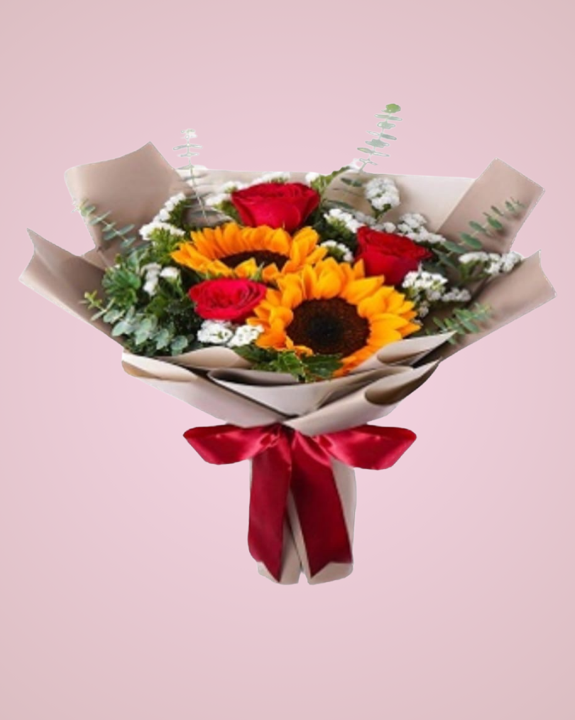 - 3 red Rose , 2 sunflower ,3 white statice , Half Bunch Seasonal green