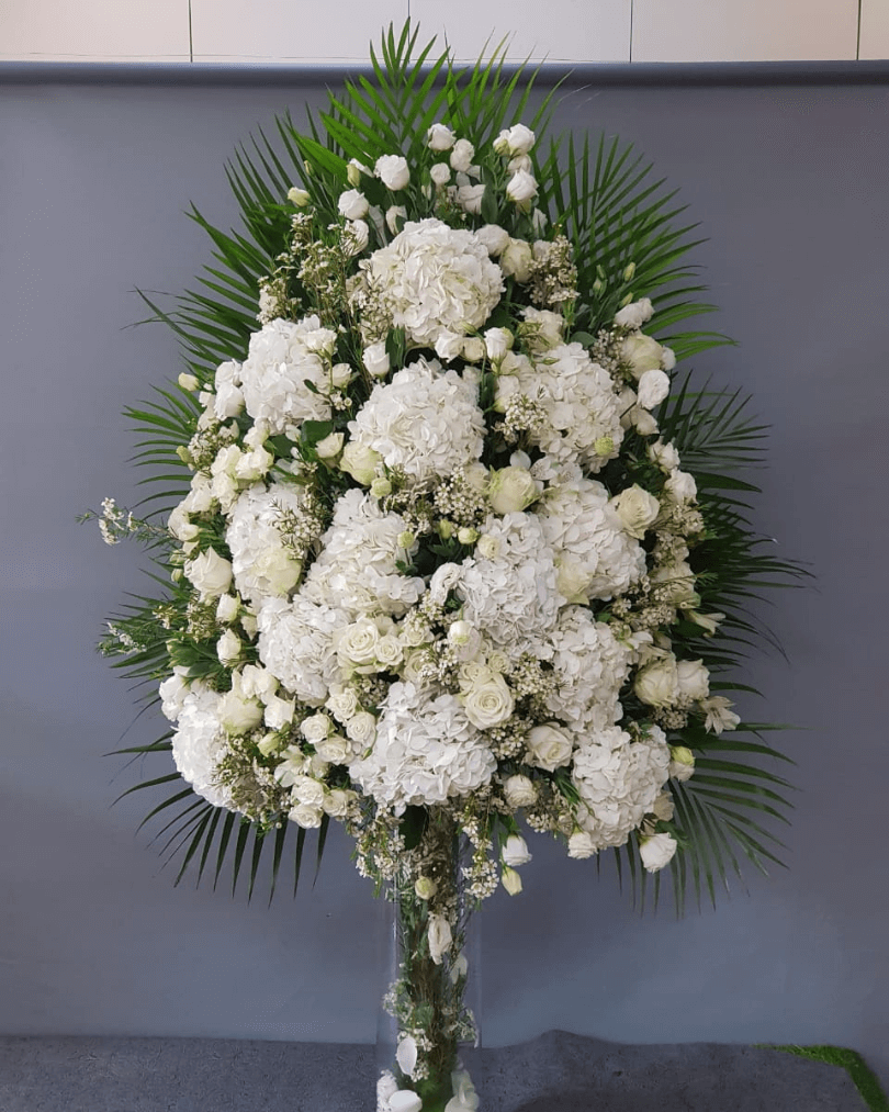 white hydrangya,white astoma, white wax with green facing arrangement.