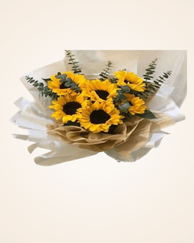 - 6 sunflowers, one bunch eucalyptus